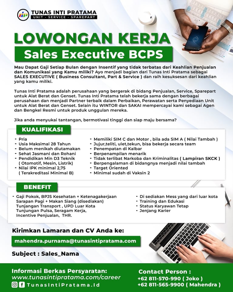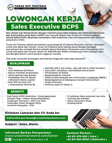 Mau Dapat Gaji Setiap Bulan dengan Insentif yang tidak terbatas dari Keahlian Komunikasi yang Kamu miliki? Ayo menjadi bagian dari Tunas Inti Pratama sebagai SALES EXECUTIVE ( Business Consultant, Part & Service ) dan raih kesuksesan dari keahlian yang kamu miliki.